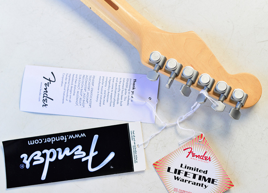 For the first six months of 1989 production Fender shipped with the Silver/Silver/Blue Lace Sensors before moving to the different Blue/Silver (somtimes Gold)/ and Red Lace Sensors pickup combination. The very first ones in 1989 came with a “split” Wilkinson Roller nut. This one has the newer Wilkinson Roller nut. Later years Fender moved to a LSR roller nut that made string changes easier. ALL the early models, from 1987 through early 1990 came with a plain white pickguard. Later all the Plus Deluxe models had Pearloid pickguards.