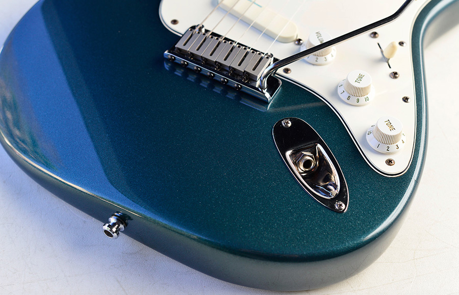 Two point tremolo bridge, Schaller locking tuners and Wilkinson Roller nut that eliminate the need for string trees give these Stratocasters great tuning stability and sustain. The TBX tone control is what really makes this guitar stand out. It gives you way more sonic options than a standard Strat. TBX is a passive circuit that can cut treble or bass giving the bridge and middle pickup a unique variety of sounds. Putting the 5-way switch in the 4th position and turning the tone control you can get a bell like sound to a honking out-of-phase mid-range sound. Put the switch in position 2 and get a nice quack. The 1st tone control and the volume control is a standard Fender 250k potentiometer.
