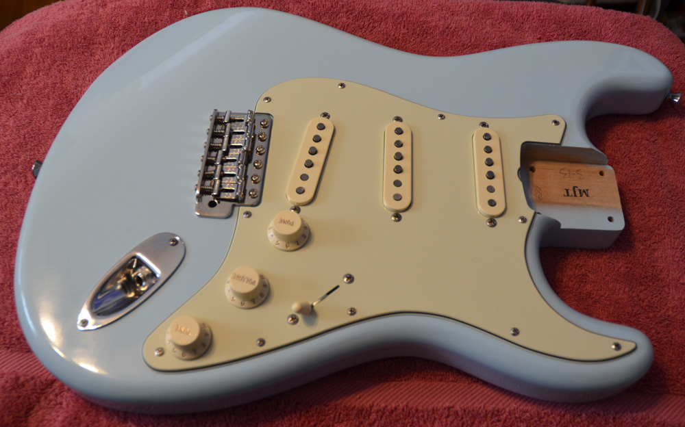 I picked up a really nice Sonic Blue Stratocaster very light relic Alder body from MJT on eBay. This body weighs in at only 3-lbs 13-oz. I had many of the parts in stock that are left over from other builds. I have the recent “Rocky Strat” build which started out with a 1963 style Sonic Blue Stratocaster. So this project is like the “father of Rocky.”