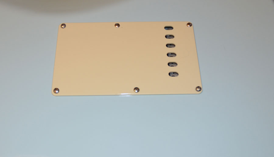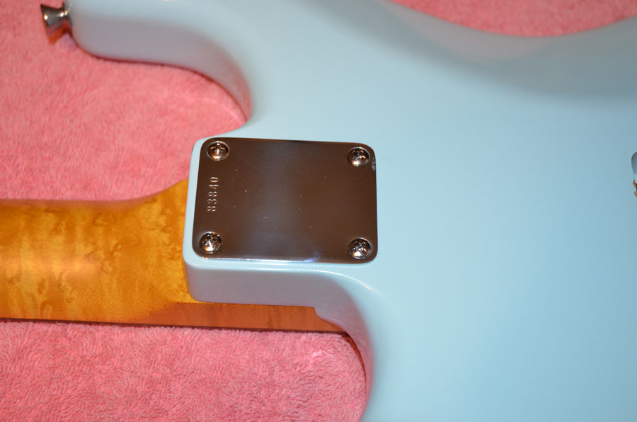 I will be using a genuine Fender mint green 3-ply pickguard and an aluminum shield. The knobs and pickup covers will be Fender aged white parts. Callaham strap buttons, Fender butterfly string tree, switchcraft jack, Fender jack cup and Fender neck plate with same serial number 83840, as George Harrison’s Sonic Blue Stratocaster.