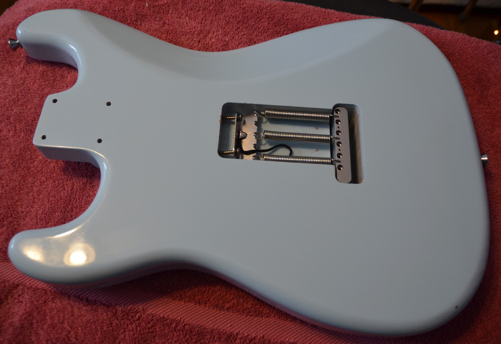 The Sonic Blue body has arrived and I copper foiled all the cavities to reduce hum.