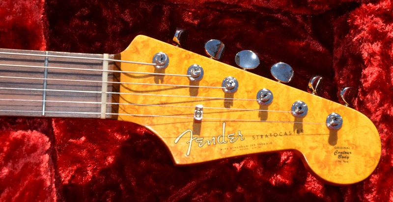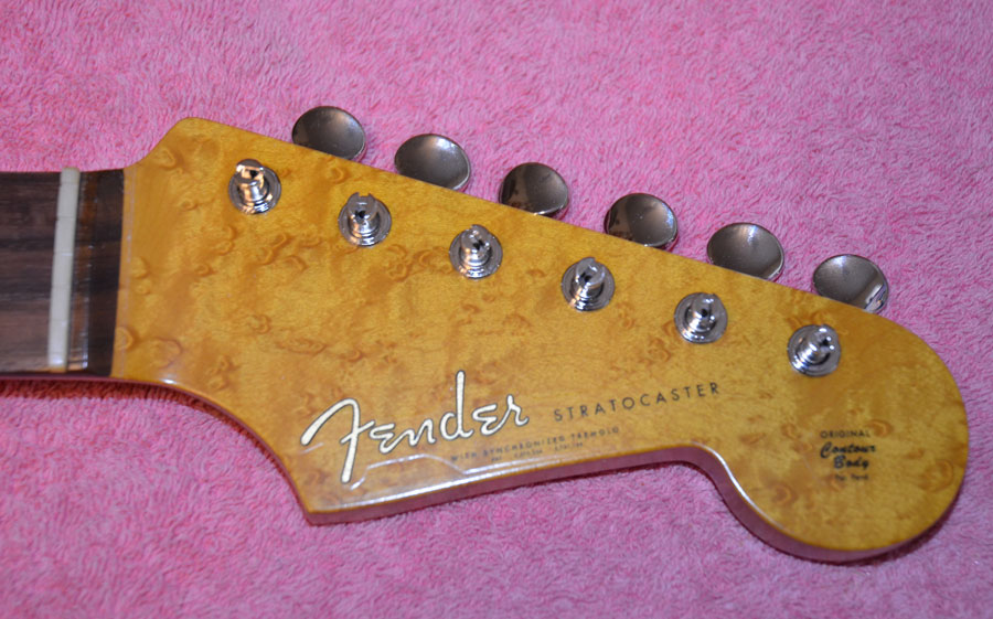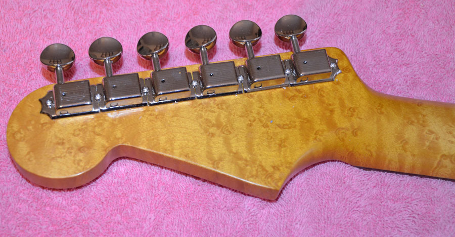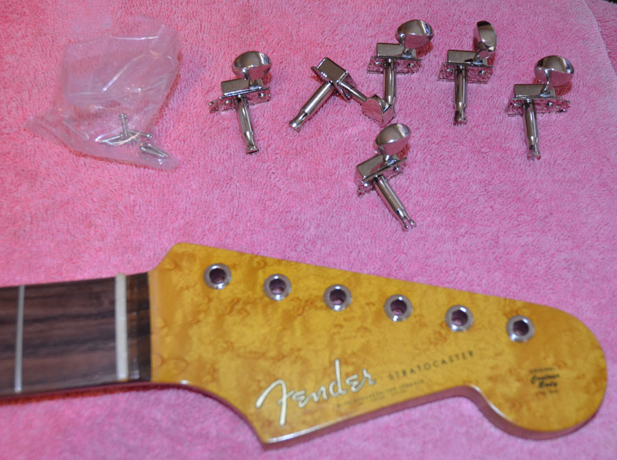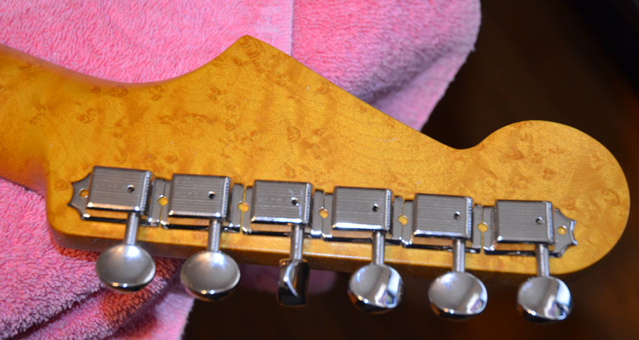Genuine Kluson traditional 6 in-line nickel tuners with one line logo just like Fender used from 1961 to 1963 on Fender Stratocasters. Ordering a period correct birdseye maple Fender licensed neck with rosewood slab fingerboard and aged clay dots.