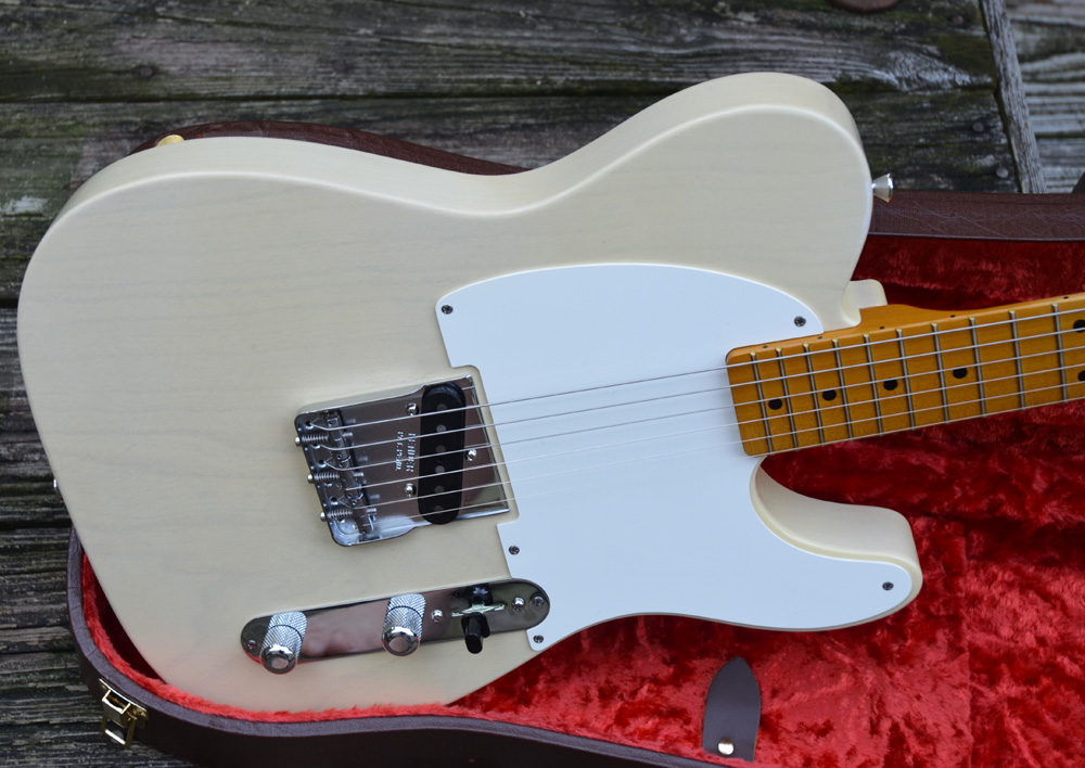 The ONE piece swamp ash body is from MJT Custom Aged Guitars. Mark and Matt Jenny do amazing work and are also a total pleasure to deal with. Their old school “vintage nitro” finishes are awesome. Matt Jenny also did the finishing on the licensed neck from Musikraft built from my specs. The QuarterSawn flamed neck is 21 fret vintage style with a 9.5 radius and a back V profiled .85 X .95, bone nut and 6105 fret wire.