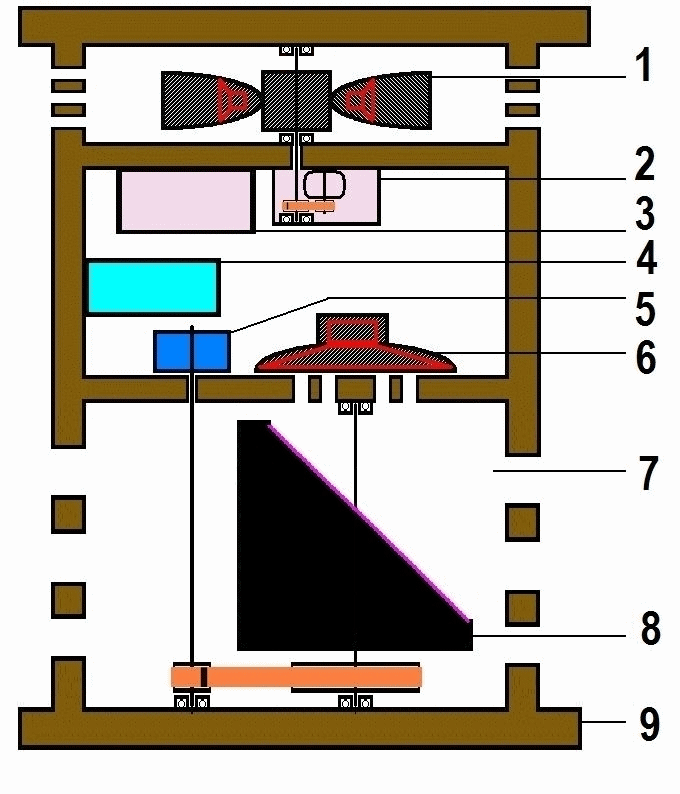 Amplifier not picturedThe audio signal enters the amplifier from the instrument. Once amplified, the signal travels to an audio crossover, which splits it into separate frequency bands that can be individually routed to each loudspeaker. Different models have different combinations of speakers, but the most common model, the 122, consists of a single woofer that faces downward for bass and a single compression driver and acoustic horn for treble. The audio emitted by the speakers is isolated inside an enclosure, aside from a number of outlets that lead towards either a rotating horn or drum. An electric motor rotates both horn and drum at a constant speed. This creates a doppler effect. Most Leslie speakers are dual speed with a fast and slow mode.