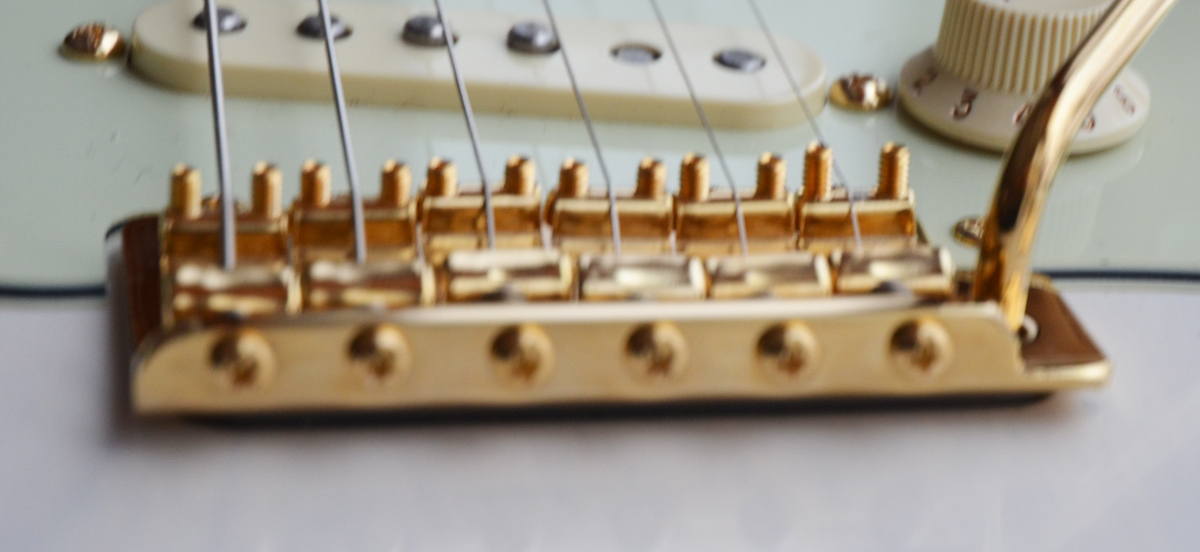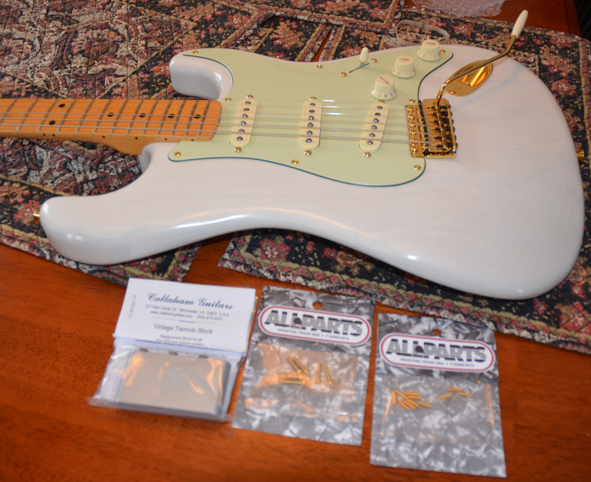 After playing the guitar for awhile I think the Fender Tremolo is killing sustain and is not precise enough to be comfortable. Since the hardware on this guitar is gold and I want to keep the vintage period correct look it limits my options a bit. So the solution is to replace the tremolo block to improve the sound and usability and keep the rest of the gold Fender hardware.
