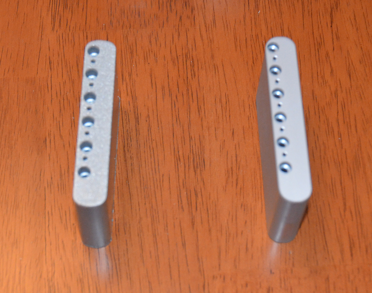 The Fender block looks to be made of a more ferrous or porous metal. There is a small chip in the Fender block which is the way it was received and you can see the make up of the metal they used. The Callaham is solid steel.