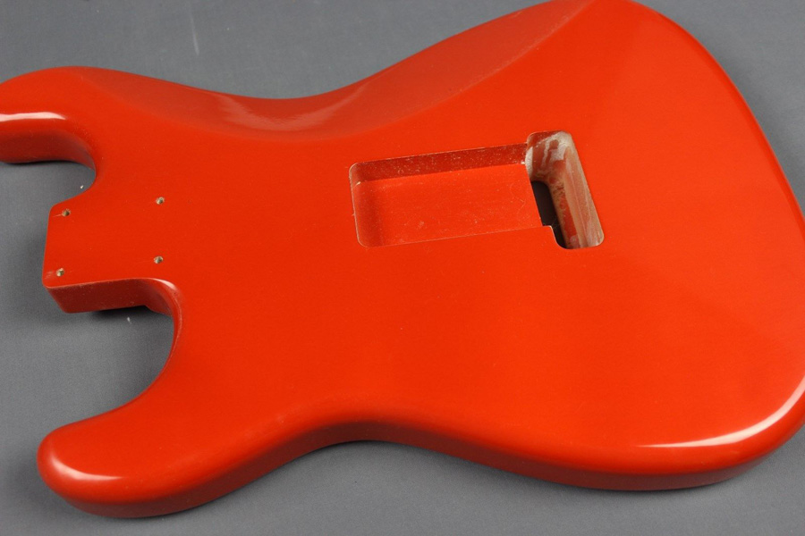 The project starts with a red old school nitro finished Strat body from MJT Custom Aged Guitar Finishes I bought on eBay. I have built quite a few projects with their bodies and Mark and Matt are a pleasure to deal with. I recommend them highly and the quality of their bodies and the finishing is top notch. This body is a pretty clean light relic weighing around 4-lbs in Fiesta Red.